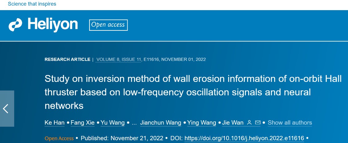 此外,2022年11月21日,Cell子刊《Heliyon》(IF=3.776)在线发表了学科团队的另一项重要研究成果,论文题目为“Study on inversion method of wall erosion information of on-orbit Hall thruster based on low-frequency oscillation signals and neural networks”(基于低频振荡信号和神经网络的在轨霍尔推力器壁面侵蚀信息的反演方法研究)。韩轲教授为论文第一作者。该论文研究内容面向国家重大需求,首次提出了一种基于低频振荡信号和神经网络的在轨霍尔推力器壁面侵蚀信息的反演方法,得到了Cell出版社期刊编辑和审稿人的认可。本研究工作得到了国家自然科学基金项目资助。