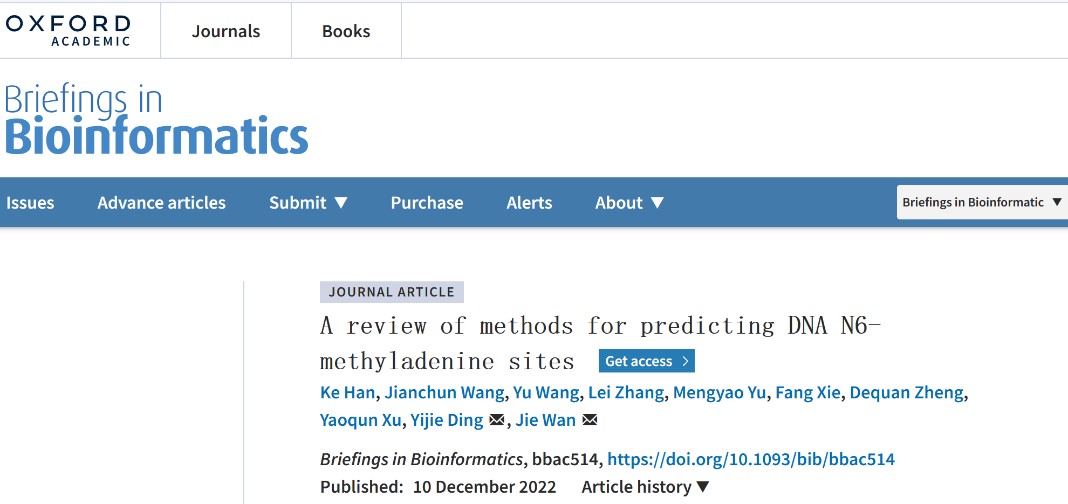 近日,我校计算机与信息工程学院计算机应用技术学科团队成员韩轲教授为第一作者、硕士研究生王剑春为第二作者,郑德权教授、徐耀群教授等为共同作者,在国际顶尖的生物信息学权威期刊《Briefings in Bioinformatics》在线发表综述论文“A review of methods for predicting DNA N6-methyladenine sites”( DNA N6-甲基腺嘌呤位点预测方法综述),该期刊影响因子为13.994,中科院一区Top期刊、CCF B类期刊,创学院已发表国际期刊影响因子新高。该项研究工作得到了国家自然科学基金和黑龙江省自然科学基金项目资助,是计算机应用技术学科团队继2021年底在《IEEE Journal of Biomedical and Health Informatics》和2022年初在《Frontiers in Pharmacology》上发表的第三篇中科院Top期刊论文。
