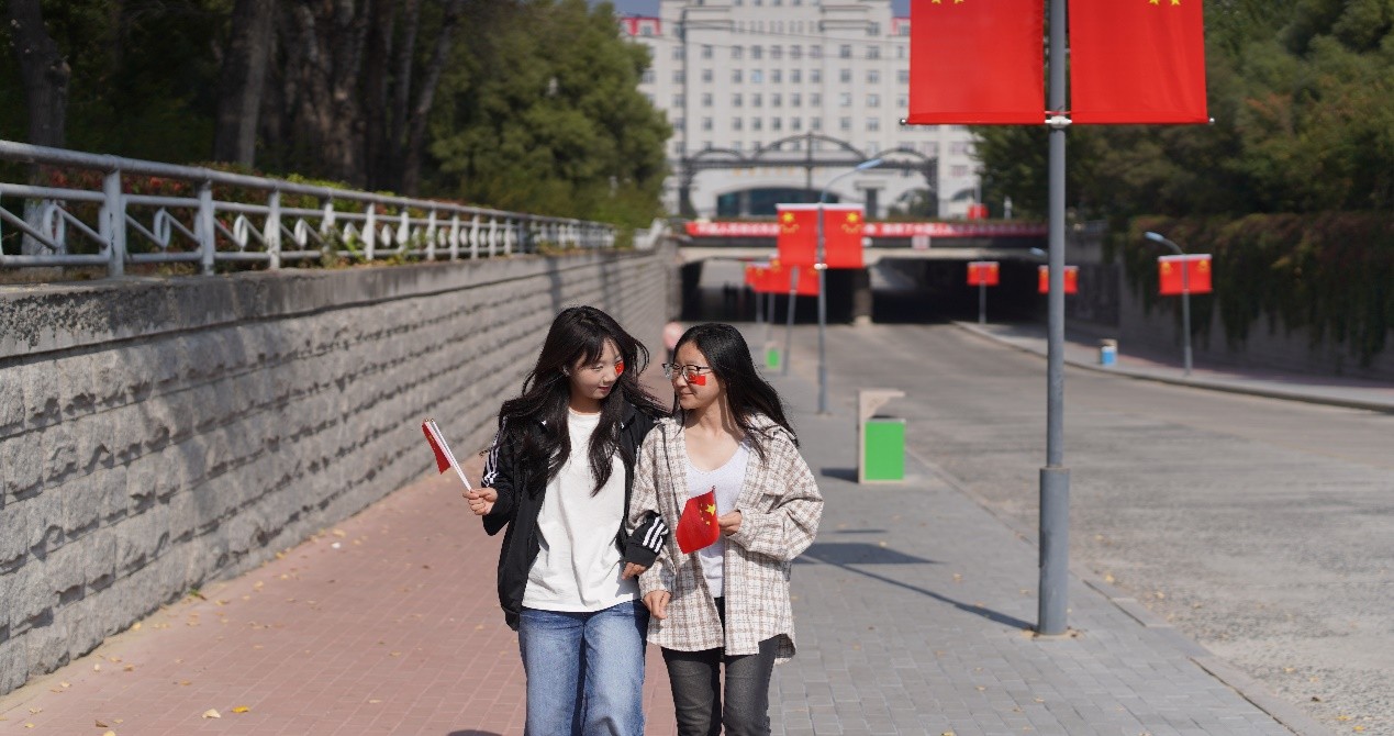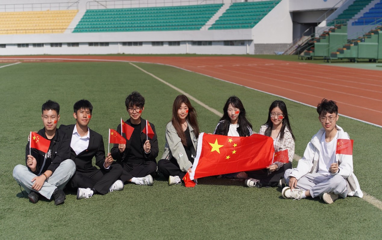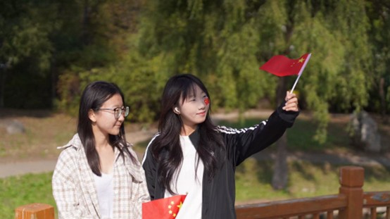 同学们手持国旗,在校园内具有象征意义的标志性建筑、美景前驻足。无论是承载学术精神的图书馆、镌刻育人理念的校训石,还是见证学子成长的体育场、教学楼,均成为青春与祖国同框的鲜明背景。大家用镜头将青年的蓬勃朝气与国旗的庄严鲜红紧密相融,直观传递出对祖国的深切热爱与美好祝福。