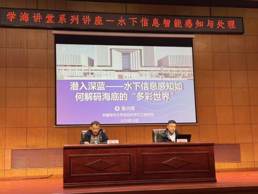 2025年10月23日,哈尔滨商业大学校友、中国海洋大学董兴辉教授莅临我校交流指导,并走进我校“镜湖讲堂”开展题为《潜入深蓝——水下信息感知如何解码海底的‘多彩世界’》的专题讲座,为师生带来了一场高水平的学术盛宴。