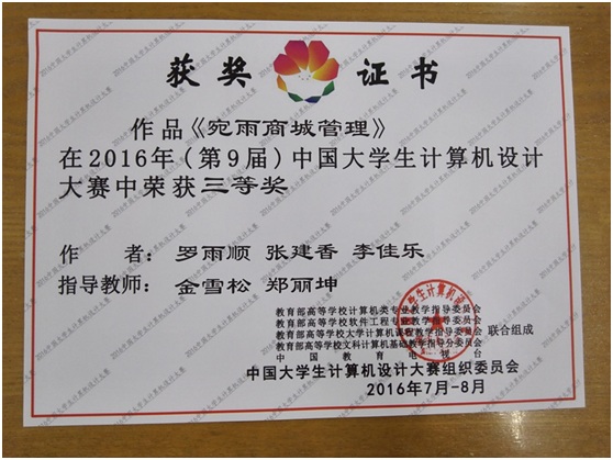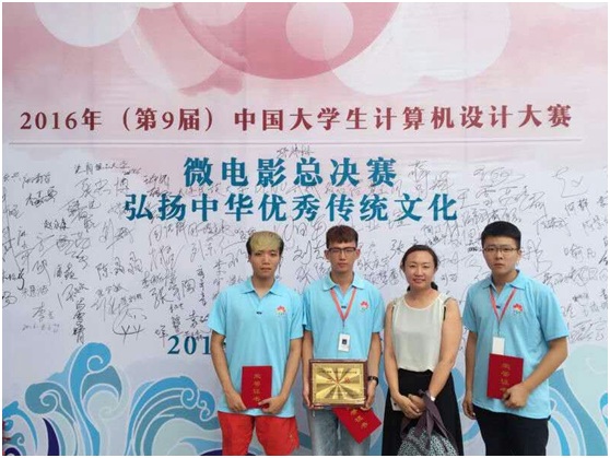 2016年暑期我校派出了经由省赛选拔出来的7支参赛队参加了五个类别的2016年(第9届)中国大学生计算机设计大赛国赛,在指导教师精心指导和参赛学生的认真努力下,取得了一个二等奖,六个三等奖的国赛好成绩。分别是:由计算机学院马慧颖等教师指导的作品《麦秸画》获得数媒设计微电影组二等奖,由计算机学院金一宁等教师指导的作品《计算机应用基础示例微课集》获得微课与课件类三等奖,由计算机学院金雪松等教师指导的作品《宛雨商城管理》、网络中心郑德权等教师指导的作品《龙江高校志愿服务网》获得软件应用与开发类三等奖,由计算机学院张艳荣等教师指导的作品《未来绿色生态城市插画组图》获得数媒设计图形图像设计类三等奖,由网络中心郑德权等教师指导的作品《生活二十四小令之春分》、《给予》获得数媒设计DV影片组三等奖。