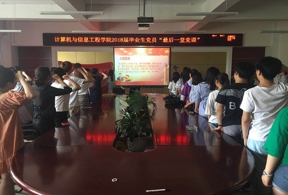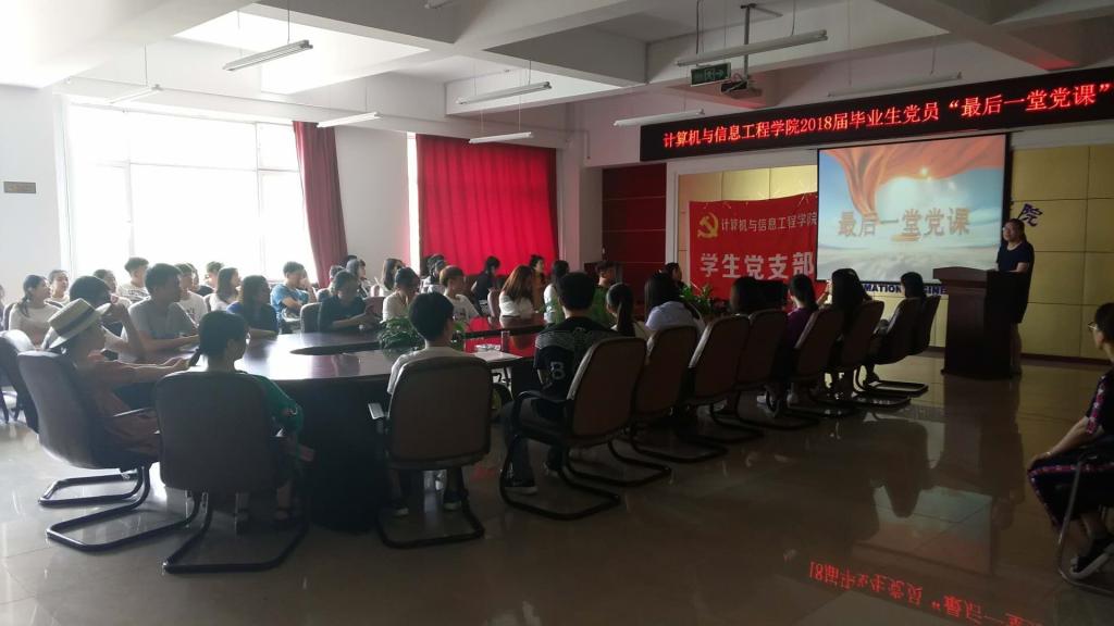 2018届毕业生党员即将离开学校,奔赴工作岗位,为引导毕业生党员站好最后一班岗,在今后的工作中立足实际,充分发挥先锋模范作用,6月22日,计算机与信息工程学院学生党支部在2210党员活动室召开毕业生党员“最后一堂党课”教育活动。