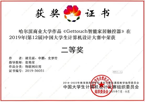 二等奖《Gettouch智能家居触控器》获奖证书  指导教师:张艳荣