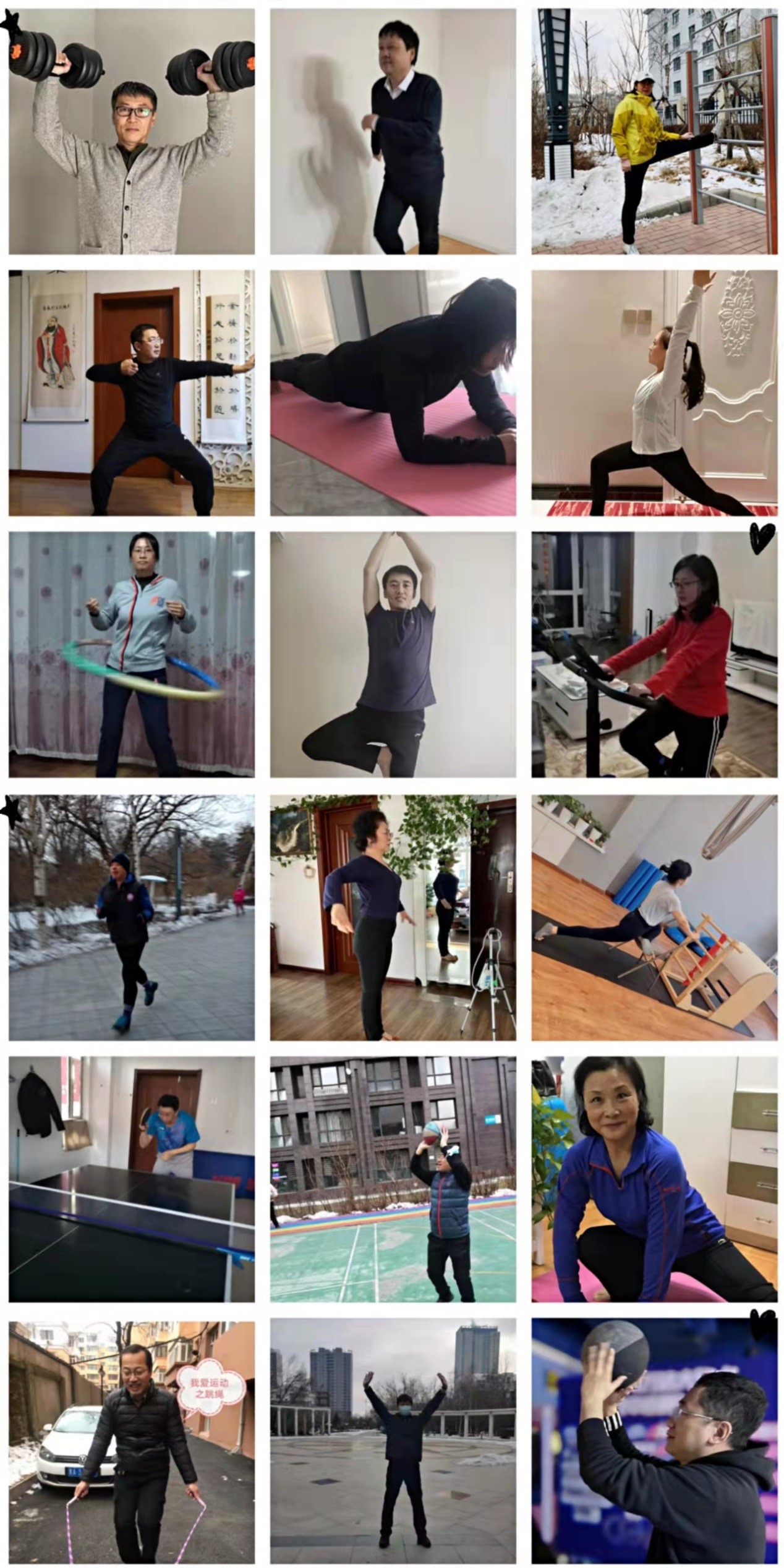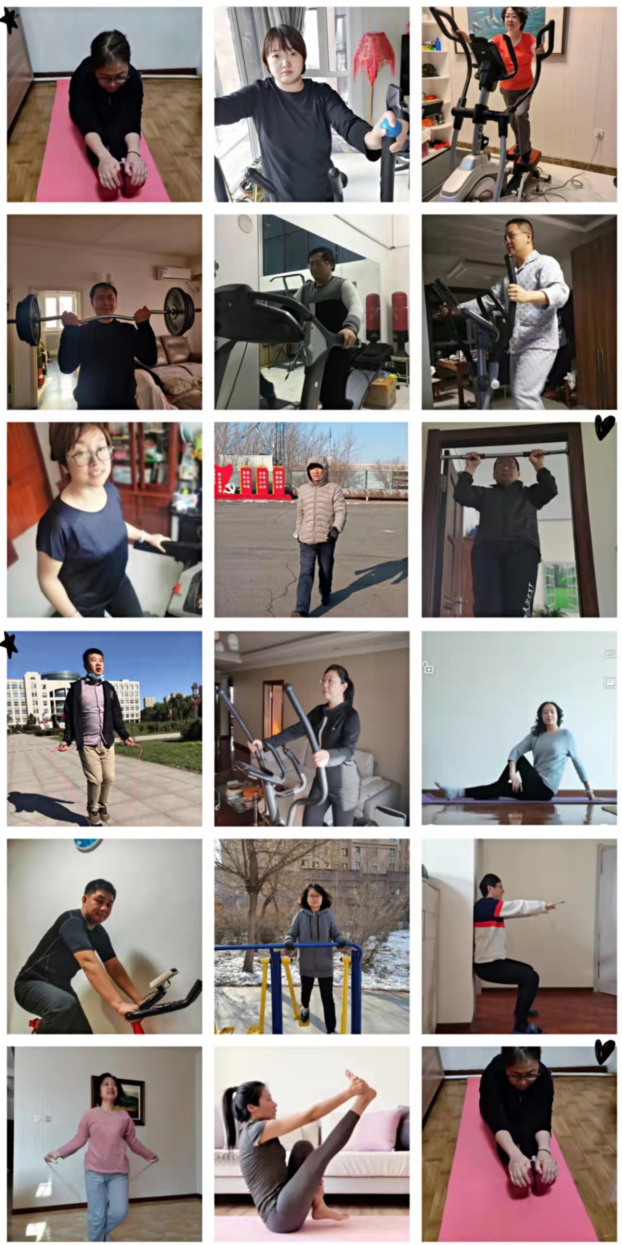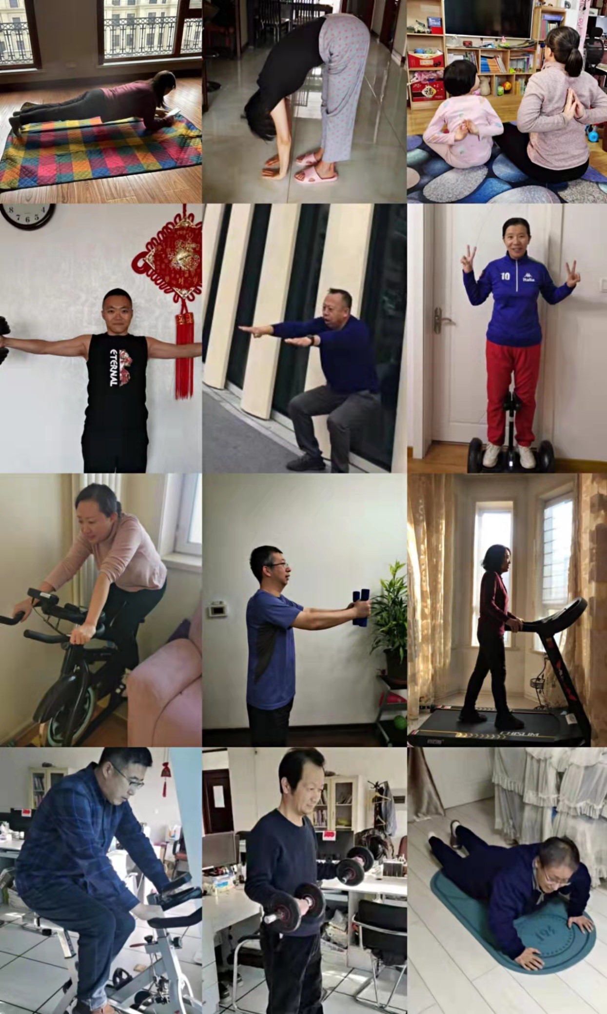 活动通知发出后,得到了教师们的积极响应,大家纷纷行动起来,兴致高涨、各显身手,在线上健身活动中挑战自我,享受运动的快乐。有做广播操、太极拳、舞蹈表演的,有练瑜伽、平板支撑、俯卧撑的,也有做广播操、跑步和打球的、也有利用健身器械健身的,形式多样,精彩纷呈。线上运动没有形式、场地和项目的限制,老师们可根据自身的喜好和特长,在适合的地方进行锻炼,把运动过程进行拍摄,发到微信群进行公开展示,百花齐放,一时间学院微信群爆屏。