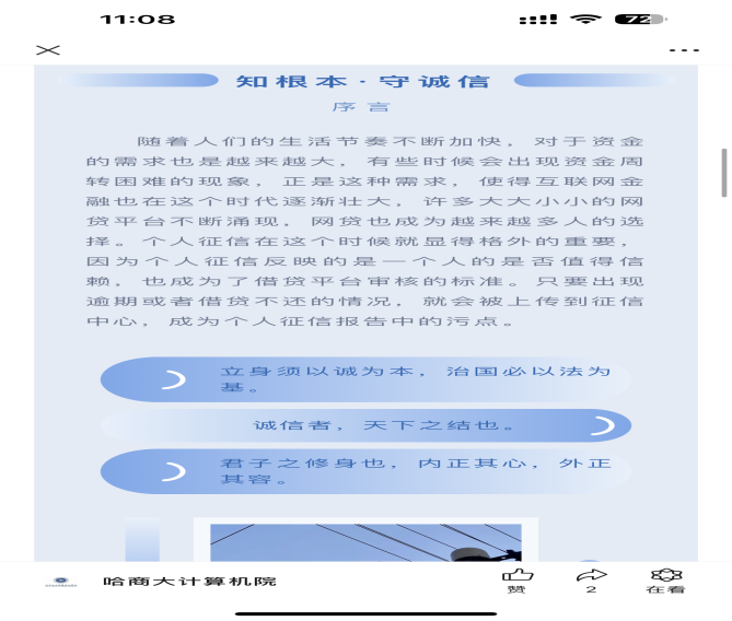 为深入学习贯彻习近平新时代中国特色社会主义思想,积极培育和践行社会主义核心价值观,发挥诚信文化育人效应,凝练商科院校特色文化,赓续哈商大诚信文化底蕴,计算机与信息工学院依托2024年“青春逐梦立长志,资助育人伴我行”学生资助诚信教育活动契机开展以下诚信文化建设系列活动,并取得良好成果。