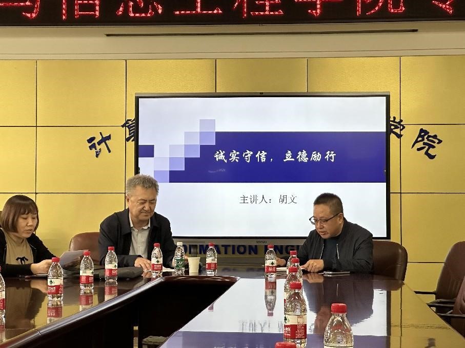 诚邀我院老院长胡文教授召开诚信主题大讲堂,倡导以诚信为荣,以失信为耻,争做诚实守信的文明学生。深入宣传征信意识、金融安全防范知识,提高学生自我保护意识,促进学生的健康成长,深化优秀中华传统文化特色人文精神内涵,营造计算机与信息工程学院明礼诚信的学院文化氛围,真正将诚信转化成了学生的情感认同和行为习惯。
