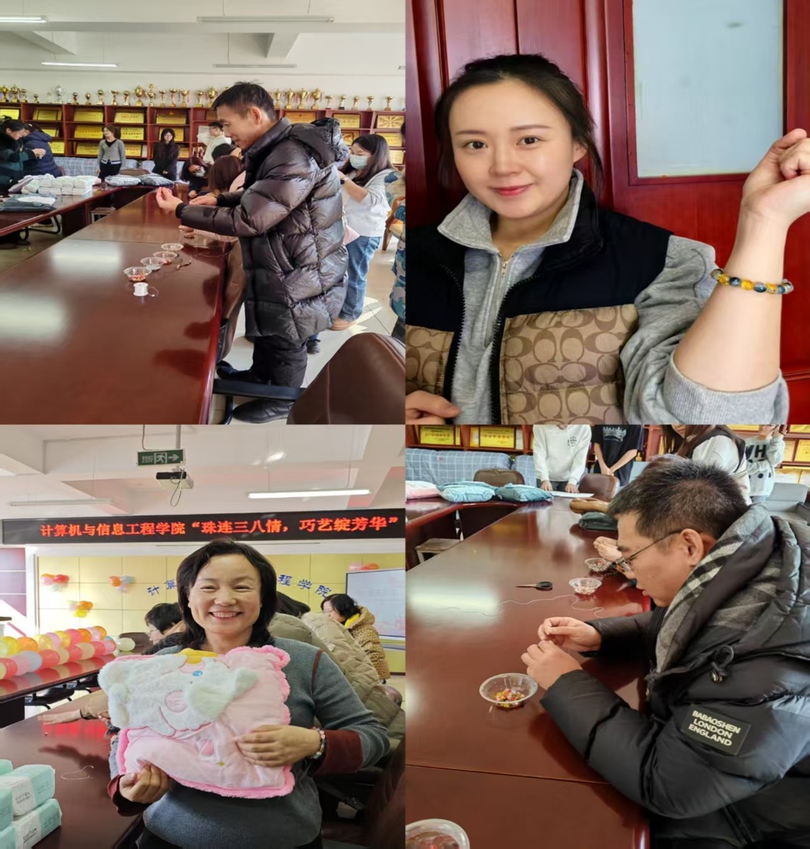 活动当天,学院精心筹备了琳琅满目的礼物。实用的洗脸巾,愿为女教师们拂去一天的疲惫;柔软的抱枕,能在休憩时给予贴心依靠,每一份礼物都承载着对女教师们深深的祝福与敬意。随后,一场别开生面的串珠活动拉开帷幕。五颜六色的珠子摆满桌面,老师们围坐在一起,挑选着心仪的珠子,开始穿起手串、挂链。在穿珠的过程中,大家相互交流、互相帮助,欢声笑语回荡在整个活动现场。还有的男老师也加入其中,感受现场热烈的氛围。一颗颗珠子在老师们灵巧的双手间串联起来,成为了一件件独一无二的艺术品,不仅串起了美好的时光,更串起了学院师生之间深厚的情谊。